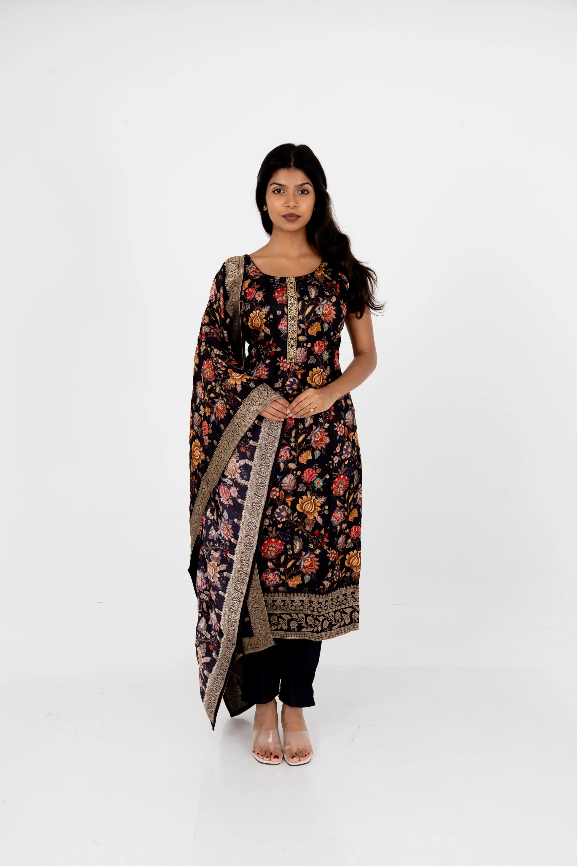Black Floral Printed Cotton Suit Set with Dupatta