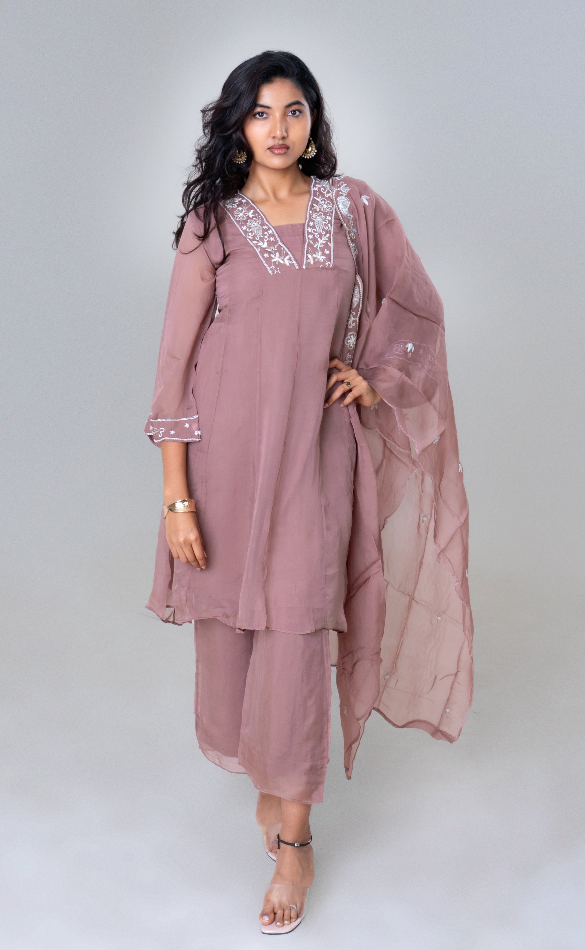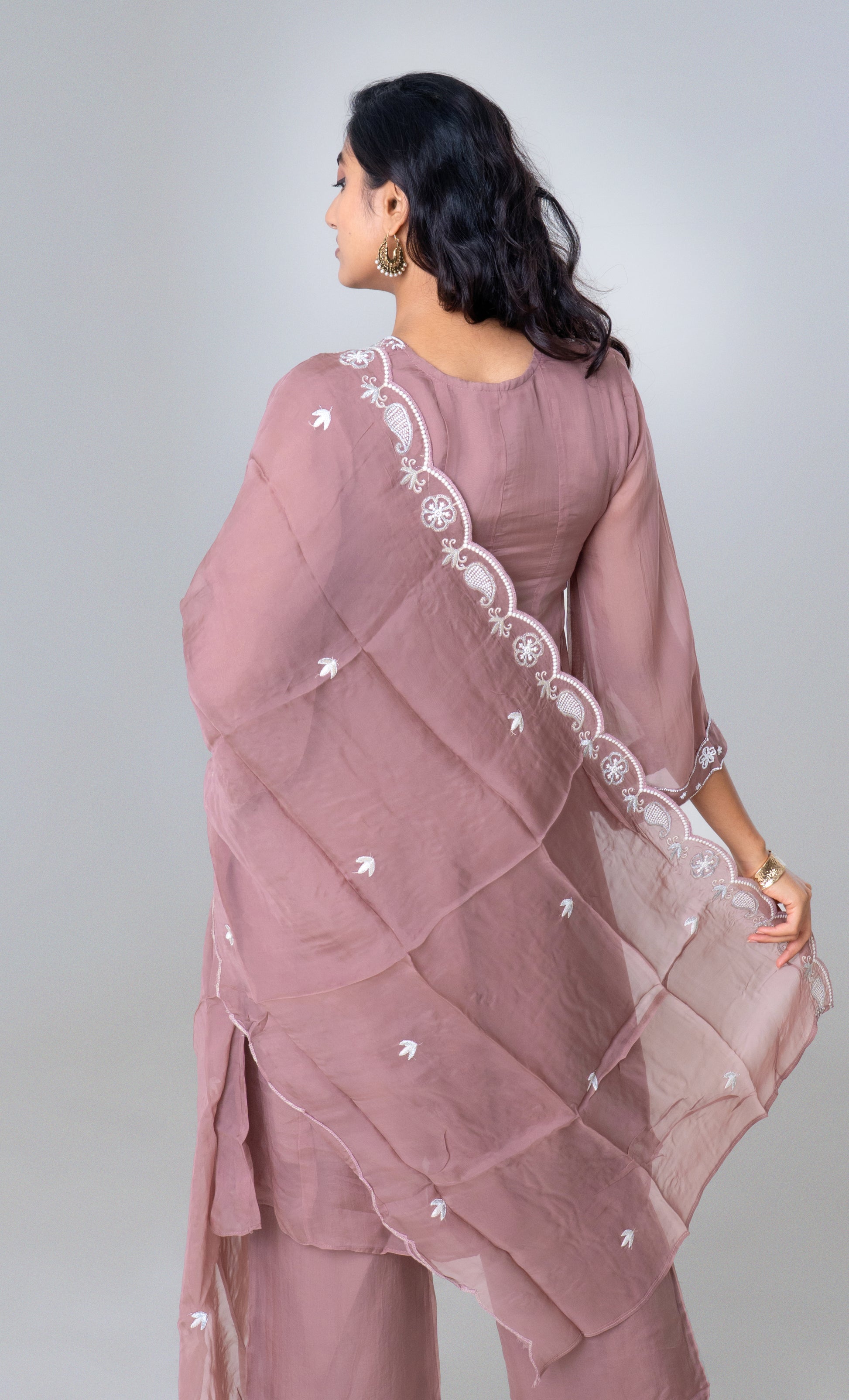 Dusty Rose Embroidered Chiffon Kurta Set with Dupatta