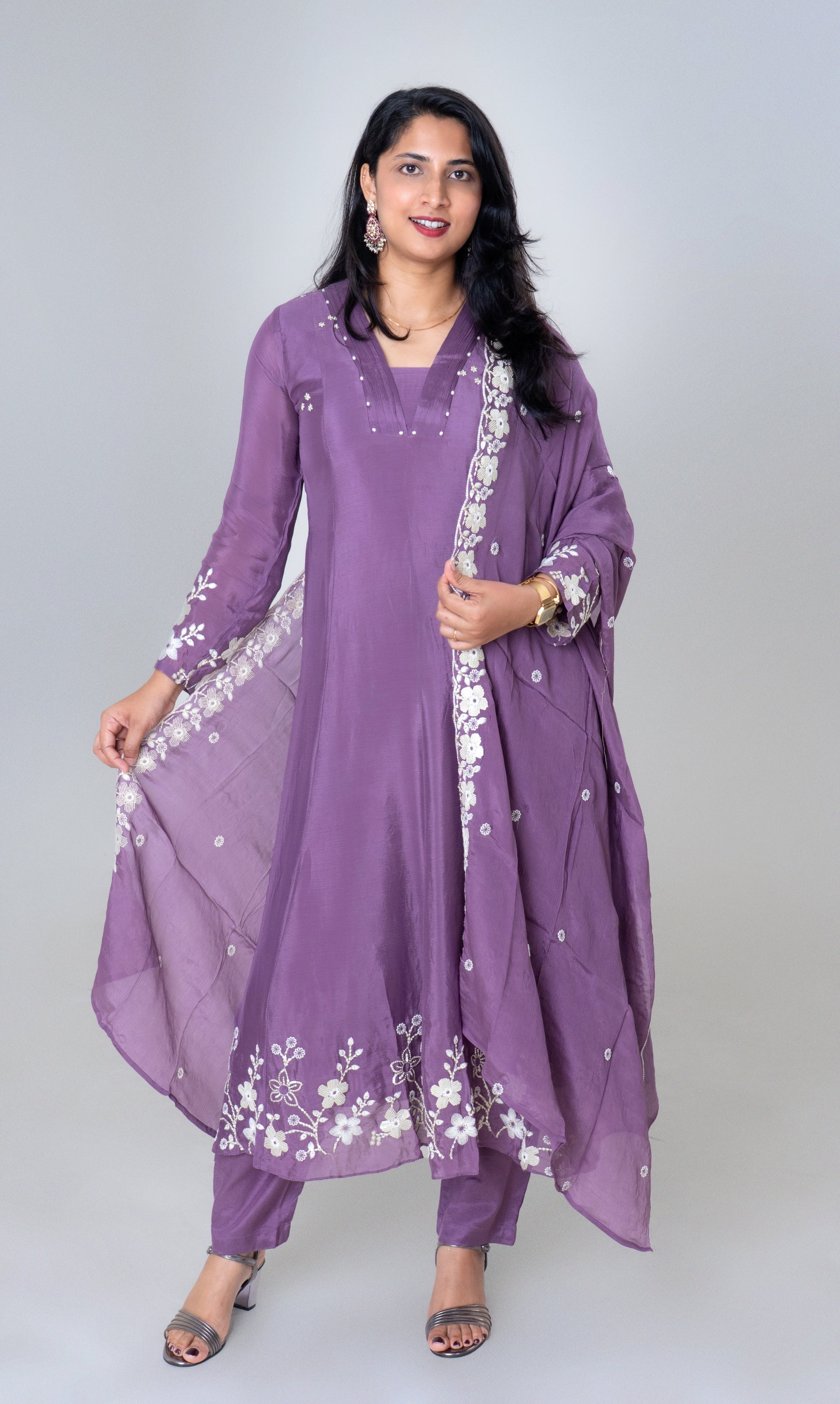 Lavender Bloom Embroidered Silk Anarkali Suit Set