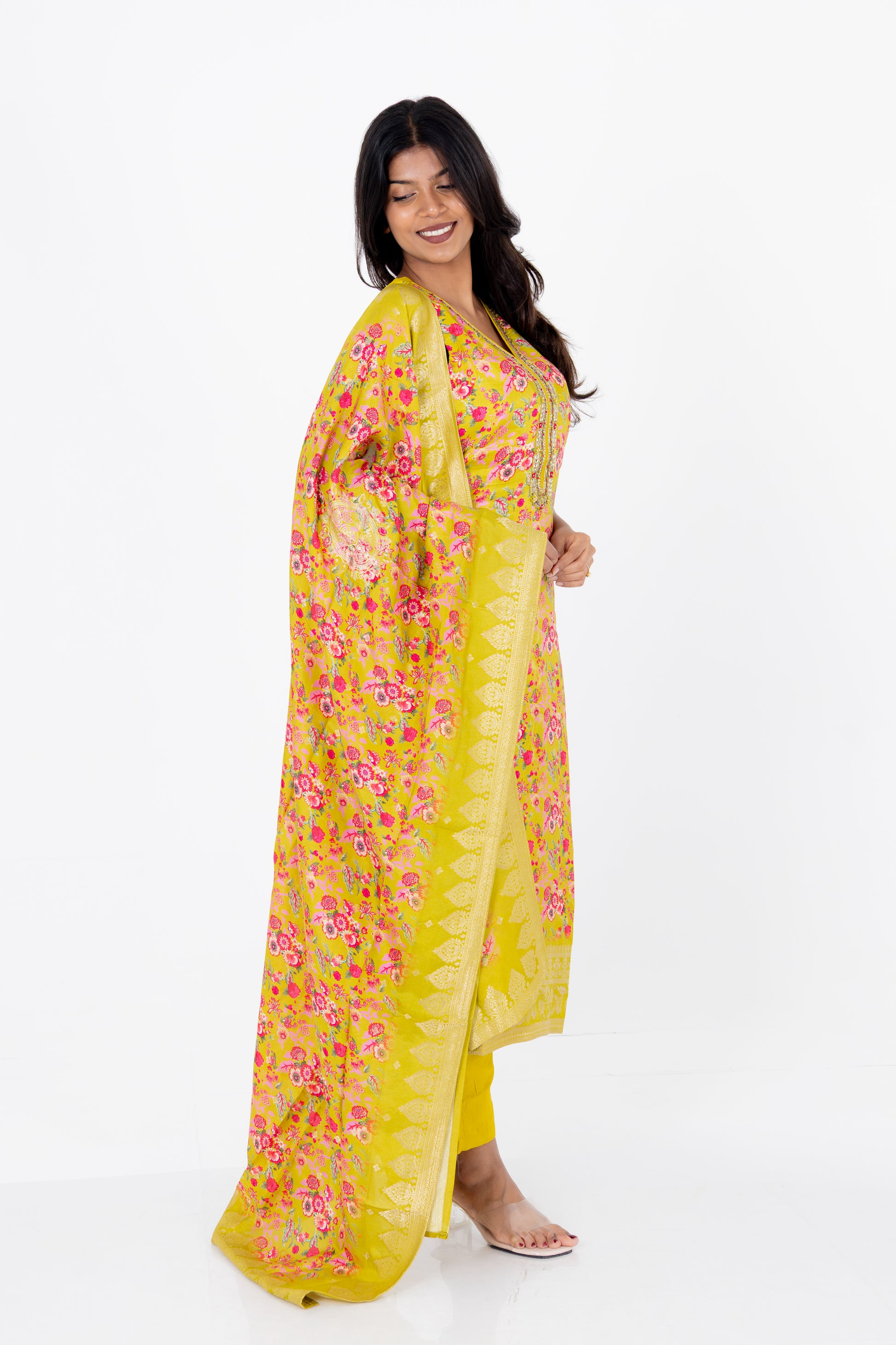 Sunlit Mustard Floral Embroidered Suit Set with Banarasi Dupatta